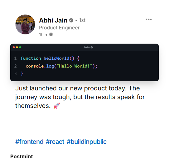 Share code snippets, architecture insights, and career milestones with posts that look like they took hours — but took 30 seconds.